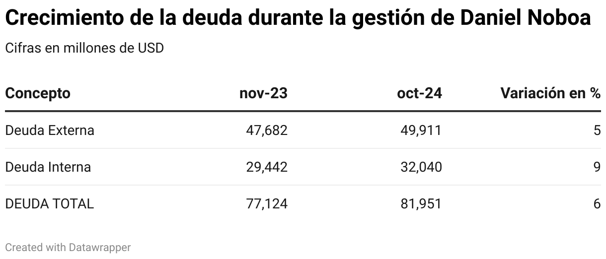 El Gobierno de Noboa ha dado prioridad al pago de la deuda externa, mientras que la deuda interna ha crecido más aceleradamente, reflejando una estrategia financiera enfocada en mantener la confianza de los organismos internacionales de crédito.